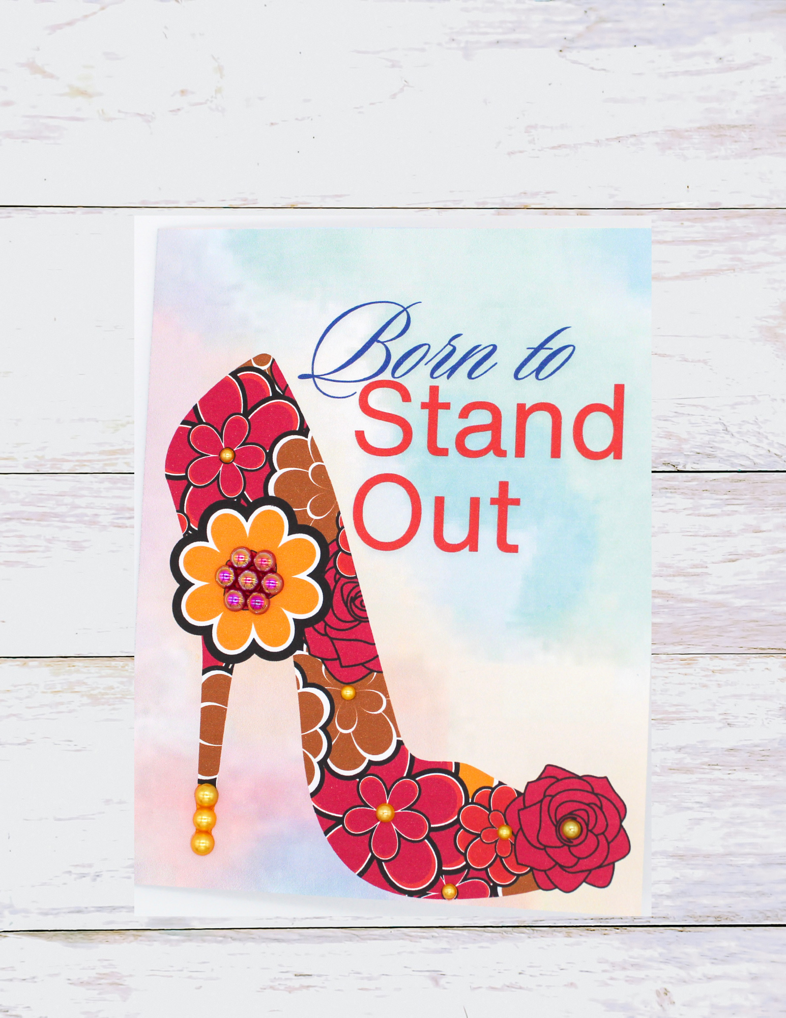 Looking for a bold and stylish card that makes a statement? Our Born to Stand Out card features a vibrant high heel design covered in floral patterns, accented with faux pearls for a touch of sparkle. Perfect for fashion lovers, trendsetters, or anyone who deserves to be celebrated in style, this handmade card is a true showstopper. Whether used as a birthday card, encouragement card, or just because, it’s designed to inspire confidence and joy.