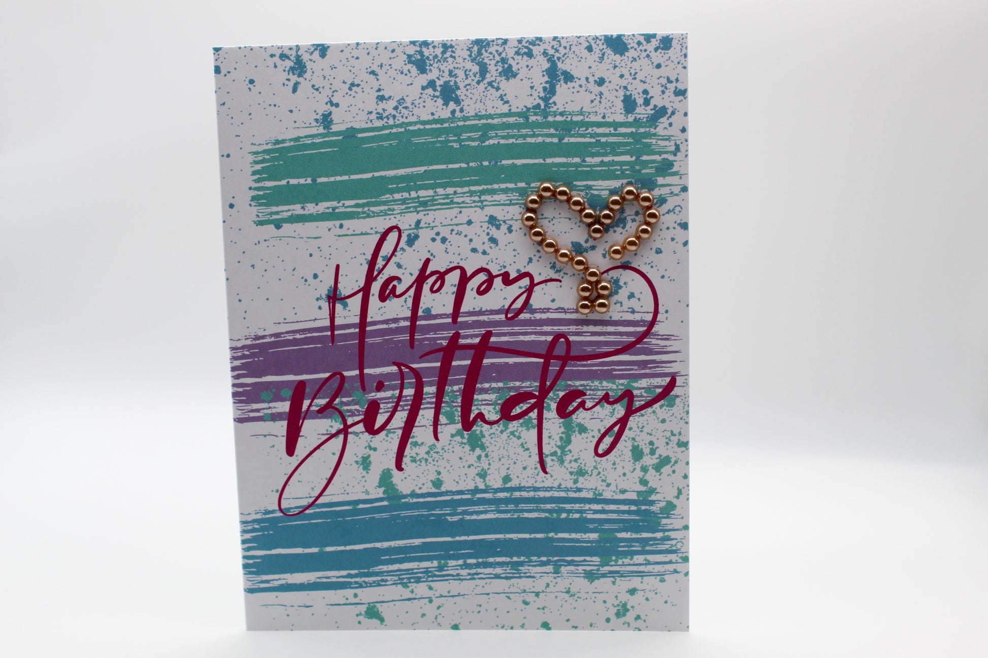 This stunning birthday card features a vibrant background of teal, blue, and purple, with playful splatters of blue adding an artistic touch. The words "Happy Birthday" are written across the front in large, elegant scripty letters, giving the card a joyful and celebratory feel. At the top towards the right, a beautiful heart adorned with gemstones catches the eye, adding a dazzling and luxurious detail. The combination of rich colors, the gemstone heart, and the artistic design creates a card that’s both heartfelt and visually striking, perfect for celebrating a special birthday with love and style.