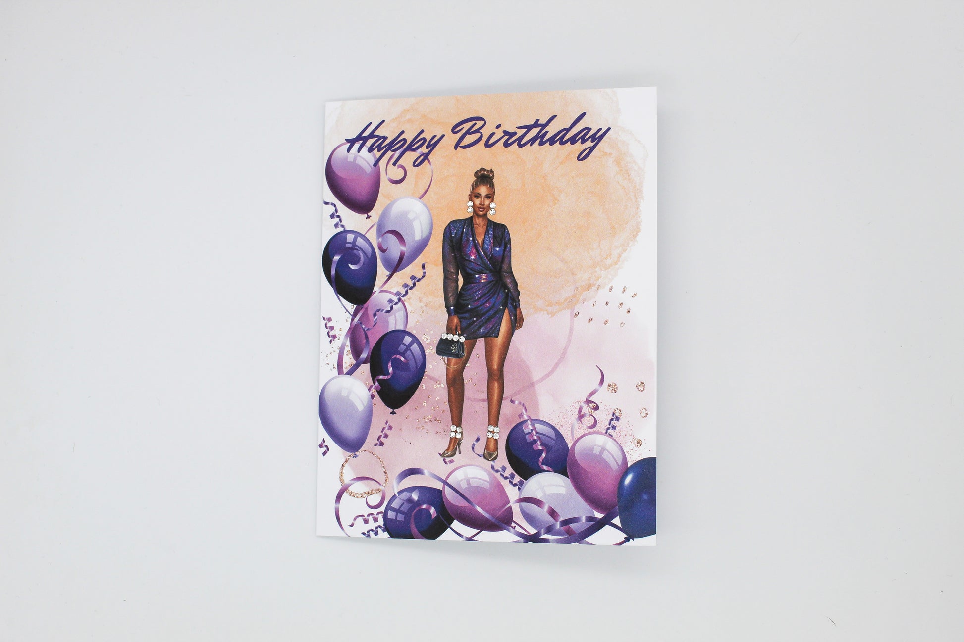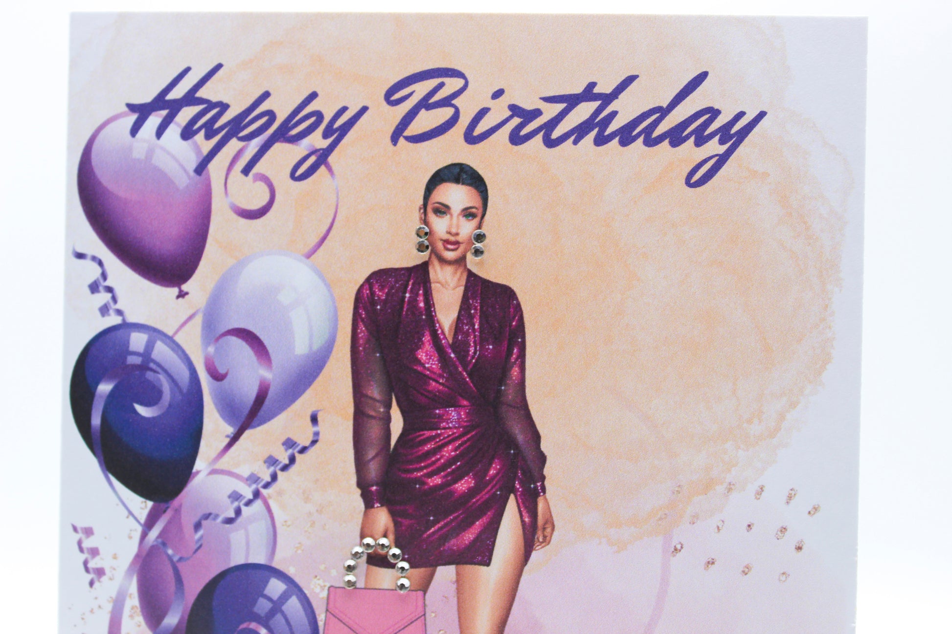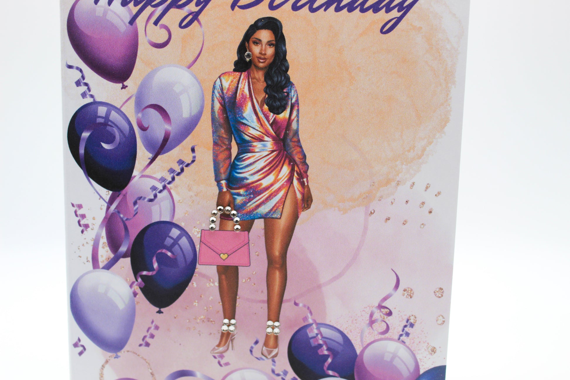 Looking for a birthday card that’s bold, glamorous, and impossible to ignore? This dazzling greeting card features a stunning woman dressed to impress in a glittering wrap dress, surrounded by a swirl of purple balloons, streamers, and sparkle. Her earrings, purse, and delicate shoe straps are all accented with hand-placed rhinestones, adding a luxurious touch that catches the light just right.