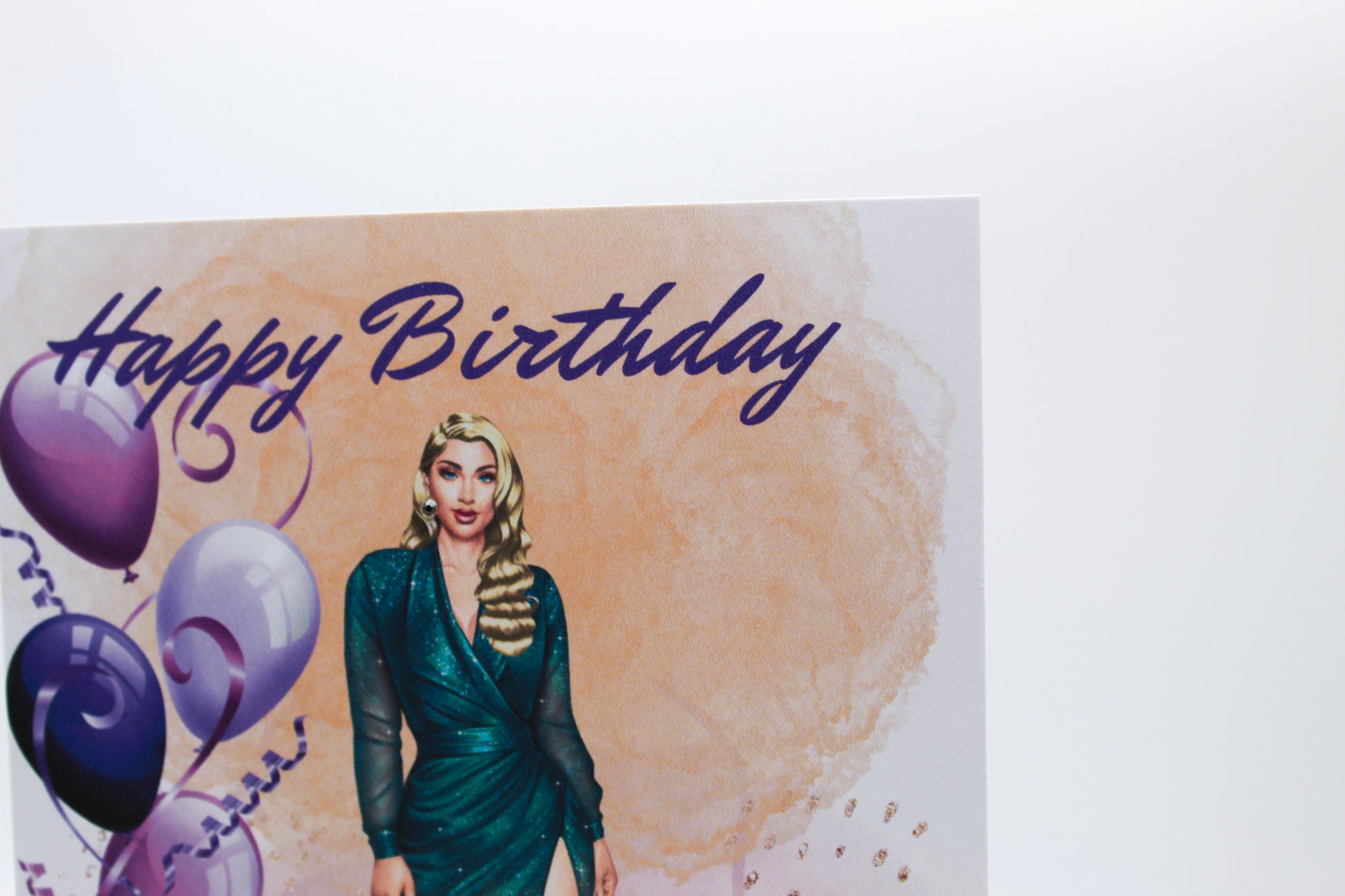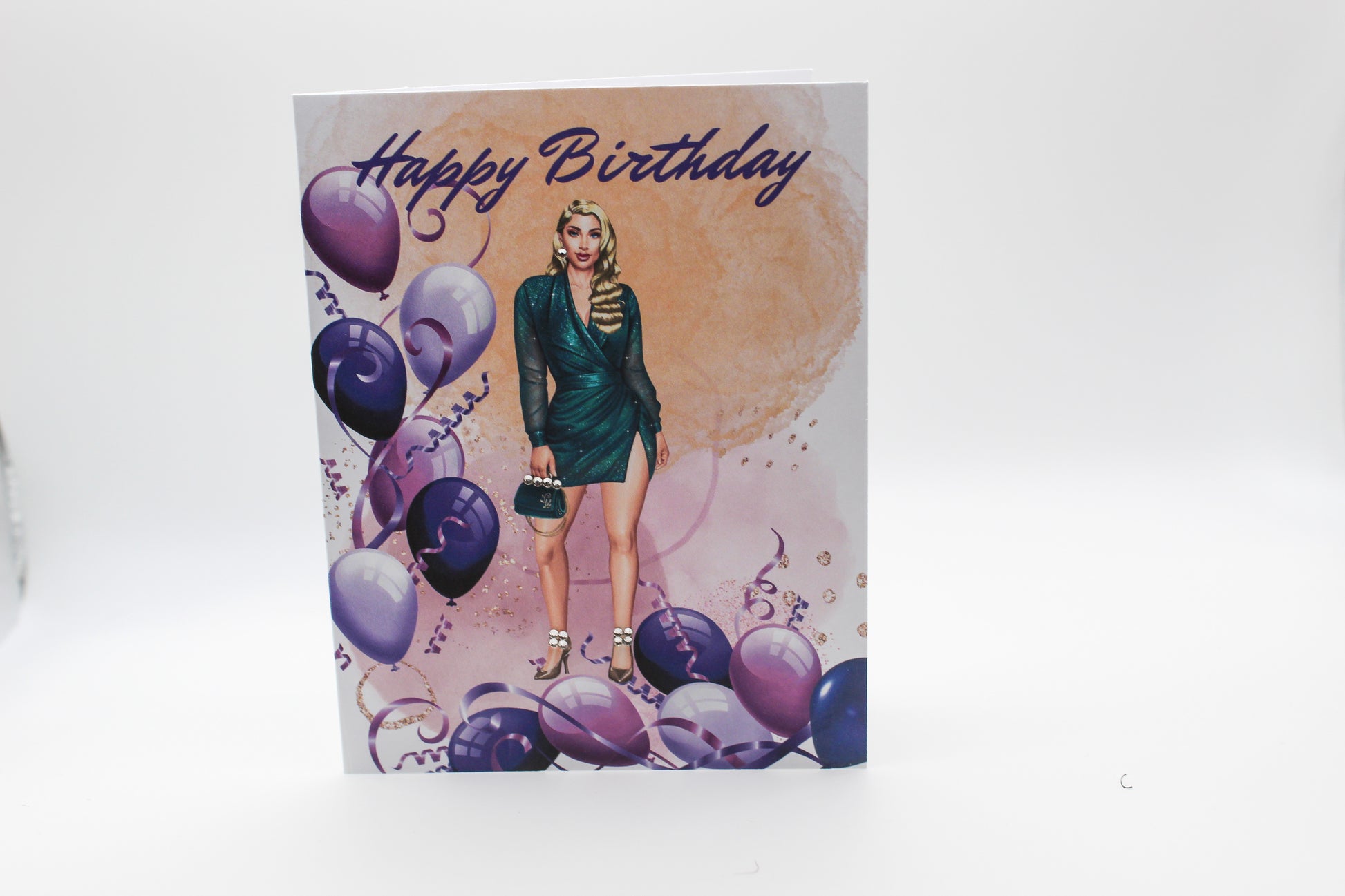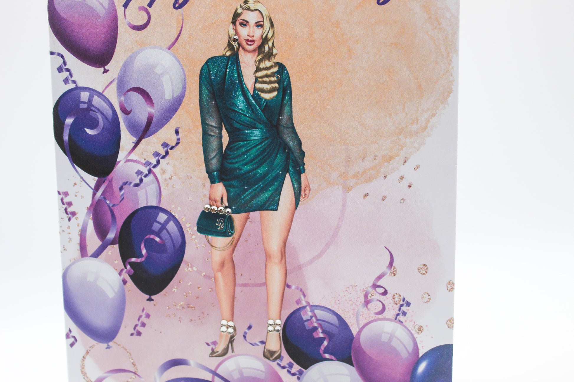 Looking for a birthday card that’s bold, glamorous, and impossible to ignore? This dazzling greeting card features a stunning woman dressed to impress in a glittering wrap dress, surrounded by a swirl of purple balloons, streamers, and sparkle. Her earrings, purse, and delicate shoe straps are all accented with hand-placed rhinestones, adding a luxurious touch that catches the light just right.