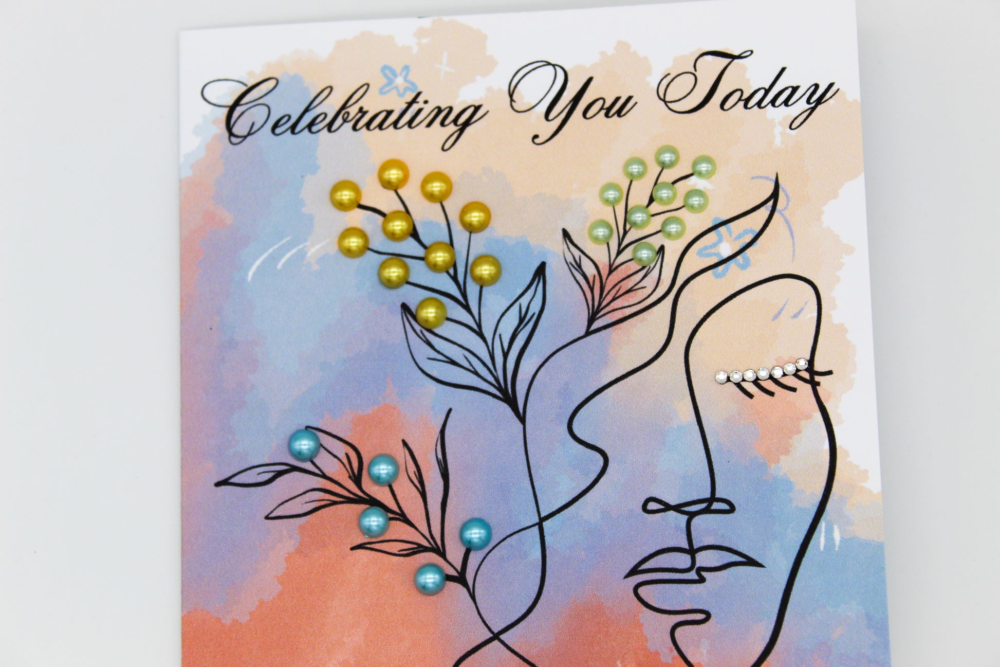 Looking for a unique card that blends modern art with elegance? This striking birthday card features a multi-color background that bursts with bright, festive colors, creating an energetic and joyful vibe. The woman’s face is beautifully adorned with dazzling rhinestones along the top of her eyelashes, adding a glamorous shimmer to her eyes. Green, yellow, and blue gemstones accentuate other parts of her face in an artistic and decorative pattern, creating a bold and captivating look. The combination of vibrant colors and sparkling gems makes this card a stunning way to celebrate someone who loves beauty, style, and a little bit of sparkle on their special day.